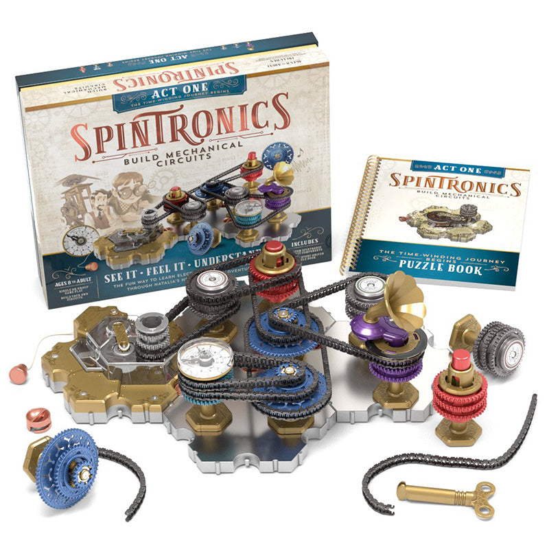 Spintronics is a new game (ages 8 to adult) where players build mechanical circuits to solve puzzles. Players feel the pull of voltage and see the flow of current as they discover electronics in a tangible and deeply intuitive way, using the first physical equivalent of electronics ever built.